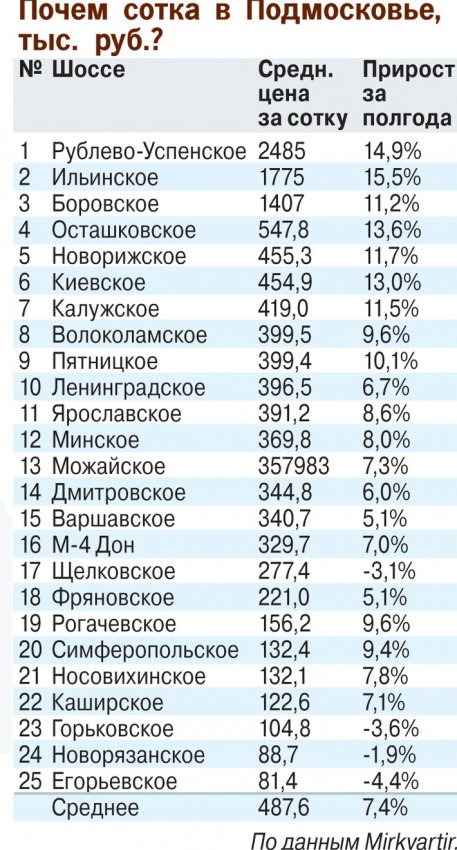 Интересно, что за первое полугодие текущего года «дешевая тройка», по данным Луценко, стала еще дешевле. Средний участок на Егорьевском направлении в среднем можно сторговать за 645 тыс. руб., это на 0,8% дешевле зимней цены. А участки на Горьковской трассе подешевели за шесть месяцев на 4,1% — до 1,42 млн руб. Кроме трех восточных направлений подешевели сотки на Щелковском шоссе: — 3,1% за сотку и — 4,6% за надел.