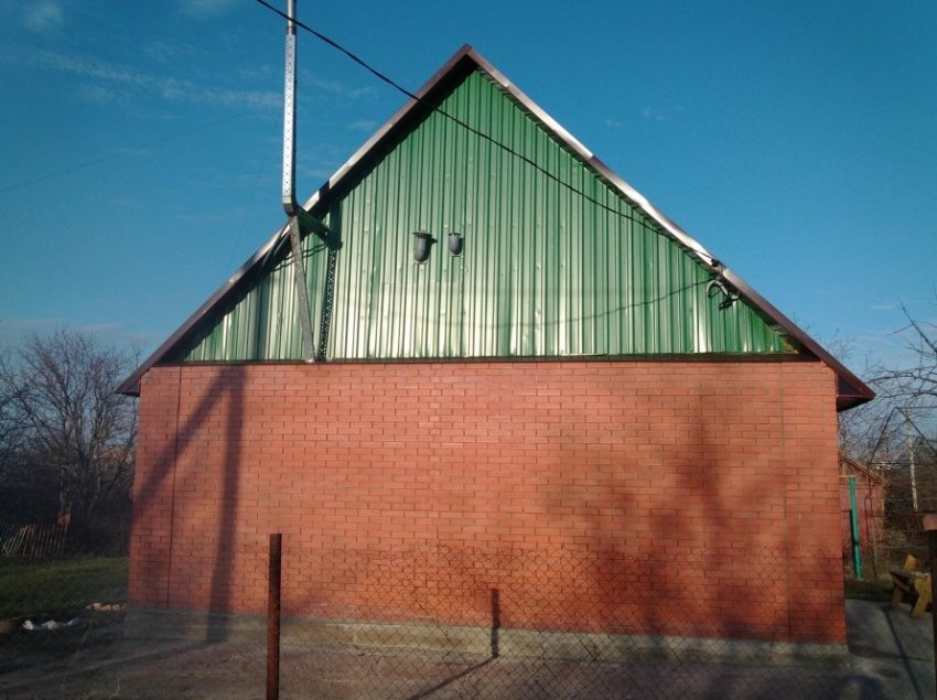 Предвидя многочисленные комментарии к сему действу, можем всех заверить, что сделано это не в целях утепления, укрепления или бог знает чего ещё, только с одним — чтобы привести дом в человеческий вид, самим же приятно глянуть. Сама эта кладка крепится к тому наипрекраснейшему зелёненькому металлопрофилю, который мы не стали снимать, ибо толку нет, а мороки много. Нагрузки никакой кирпич не несёт, от сырости и холода не спасает, если что.