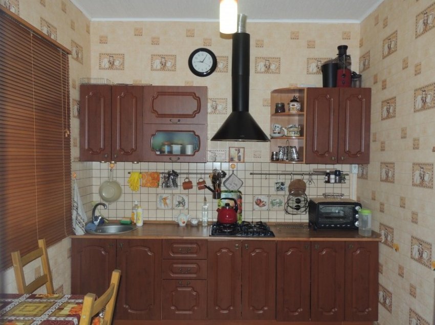 На кухне появилась вытяжка. Маленькое чёрненькое в углу справа — это электрическая минидуховка, нам хватает вполне. Варочная панель работает от всё того же газового баллона. На шкафу торчит соковыжималка — самый бесполезный агрегат, как выяснилось. Кстати, в этом году мы собирали совершенно рекордный урожай всего. Груши и яблоки до сих пор едим из собственного сада.