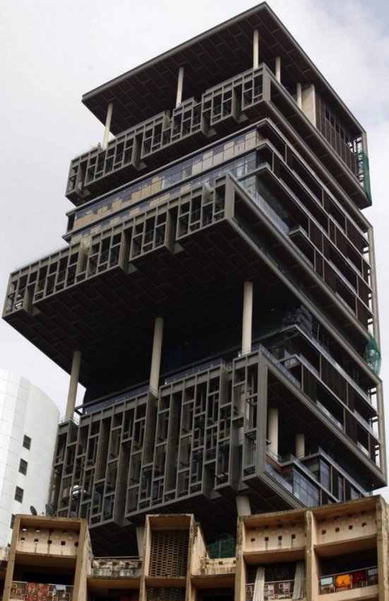 Необычное 27-этажное строение — собственность индийского мультимиллиардера Мукеша Амбани. Чтобы возвести его, Амбани потребовалось вложить около 5% своего состояния, которое оценивается в $27 млрд. В доме есть гараж на 168 мест, кинозал, оранжерея, сад, развлекательный центр, бассейн, зал для занятий йогой и даже комната с искусственным снегом. За всем этим (и не только) постоянно следит персонал численностью около 600-т человек.