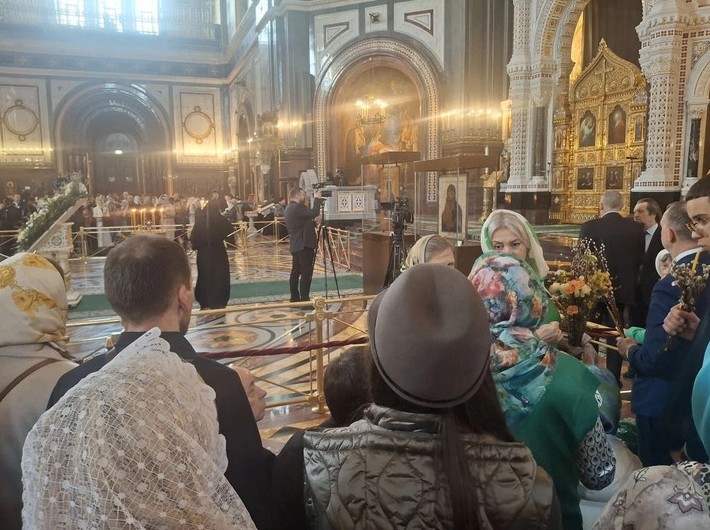 4 апреля на площади перед Храмом Христа Спасителя, где днем ранее разместили переданную Третьяковской галереей Владимирскую икону Божией Матери и временно - Донскую икону, перед началом вечерней службы накануне Вербного воскресенья наблюдается огромный ажиотаж.