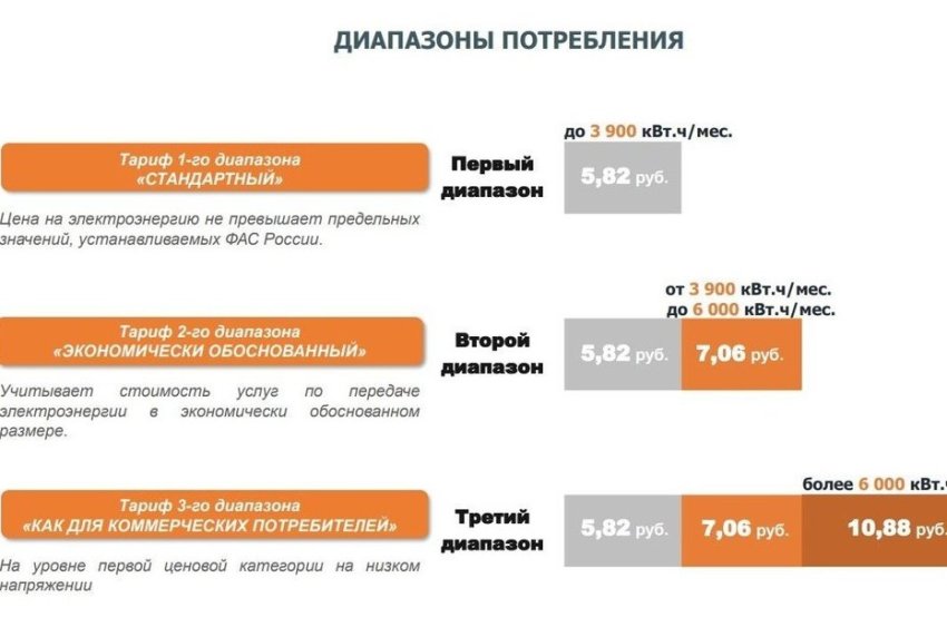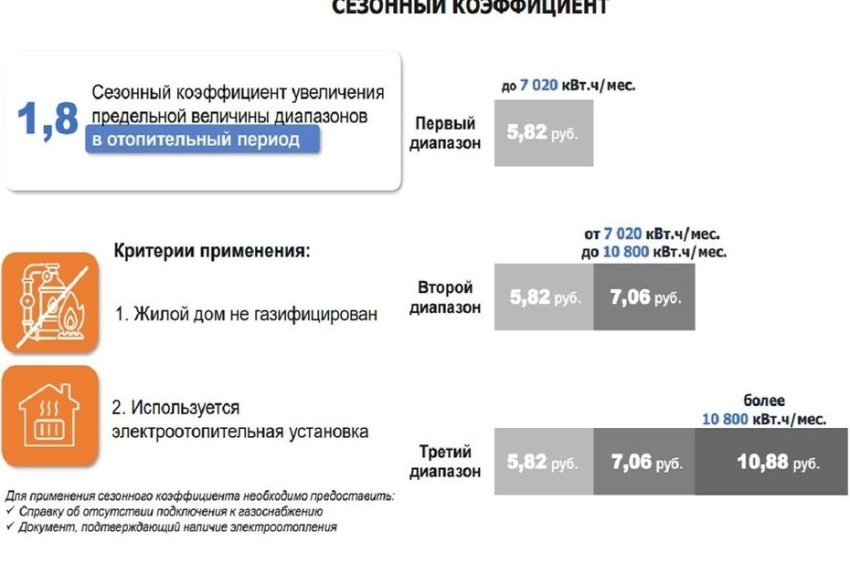 — С учетом перехода цена на коммунальные услуги будет зависеть от объема потребления в месяц, — напомнил он. — Основной принцип — чем больше расход, тем выше тариф. Объемы потребления делятся на три диапазона, для каждого из которых предусмотрены свои тарифы… Если потребление превышает первый диапазон, то разница оплачивается по тарифу второго, а при превышении второго — по тарифу третьего. Для жителей домов с электроотоплением при отсутствии газа в отопительный сезон действуют особые диапазоны с сезонным повышающим коэффициентом 1,8. Первый диапазон — до 7 тысяч 20 кВт·ч, второй — от 7 тысяч до 10 тысяч 800 кВт·ч, третий — более 10 тысяч 800 кВт·ч.