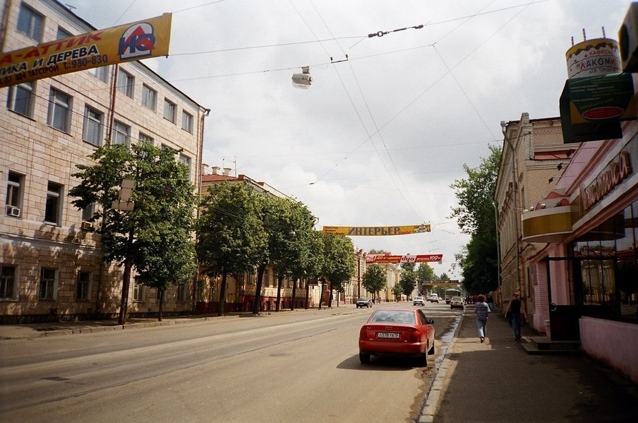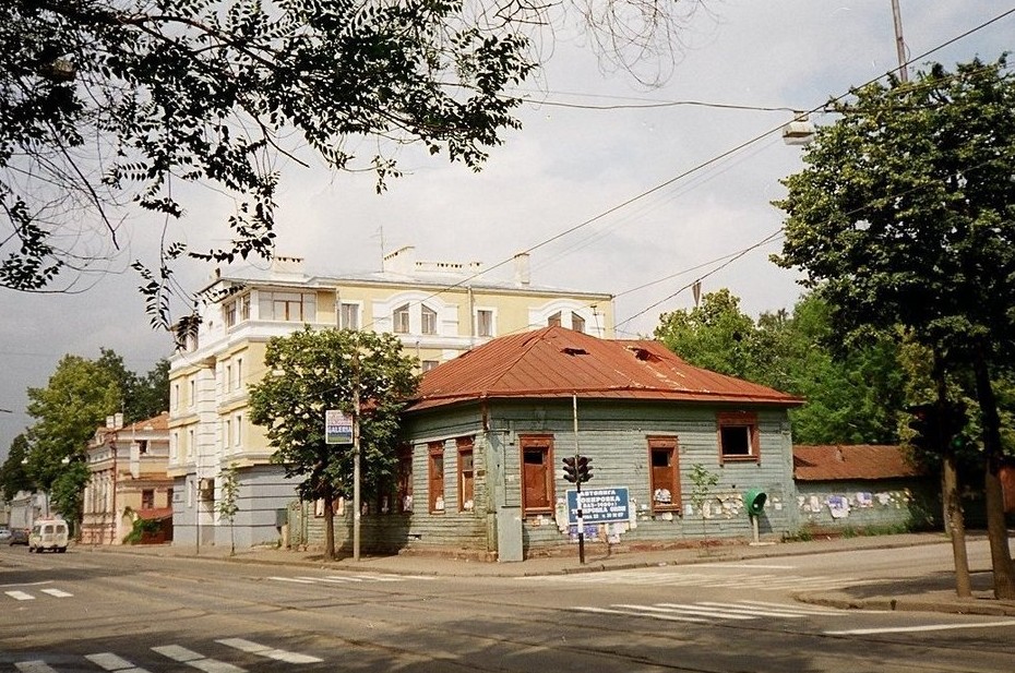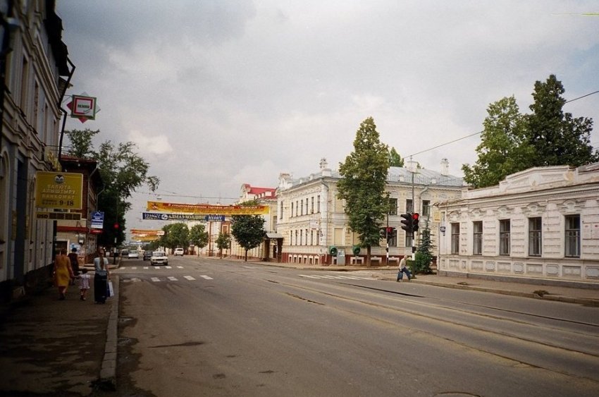 Мы на углу Карла Маркса с Гоголя. Если приглядеться, над улицей висит реклама торгового центра «Факел» на Горьковском шоссе, ныне закрытого. По центру — флигель усадьбы Оконишникова.