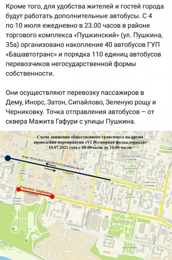 «Для удобства жителей и гостей города будут работать дополнительные автобусы. С 4 по 10 июля ежедневно в 23.00 часов в районе торгового комплекса «Пушкинский» (ул. Пушкина, 35а) организовано накопление 40 автобусов ГУП «Башавтотранс» и порядка 110 единиц автобусов перевозчиков негосударственной формы собственности. . Они осуществляют перевозку пассажиров в Дёму, Зеленую рощу и Черниковку. Точка отправления автобусов — от сквера Мажита Гафури с улицы Пушкина» (из Instagram @ufacityadm).
