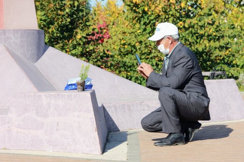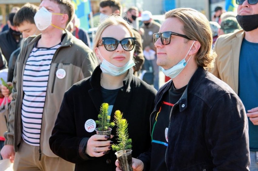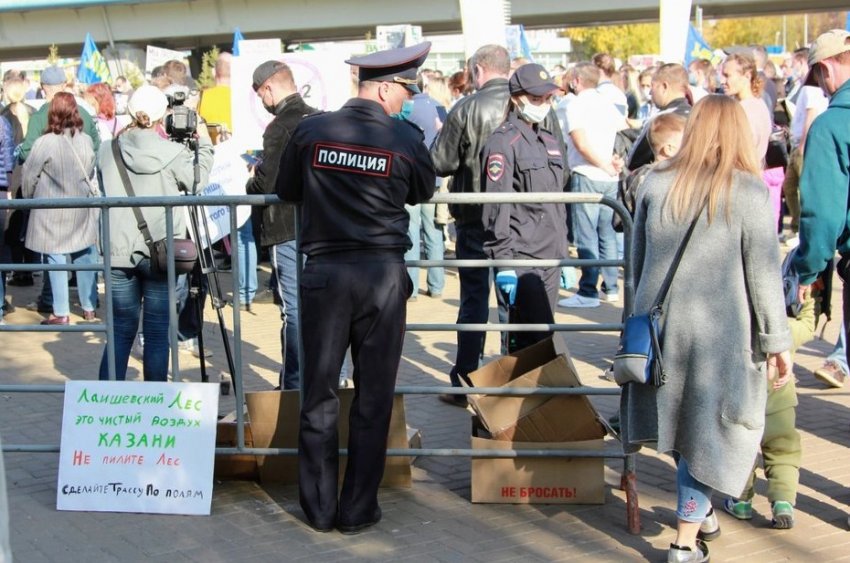 Перед огороженной площадкой в сквере Славы дежурят сотрудники полиции с металлоискателями. Рядом стоят ряды саженцев елочек в стаканах, которые раздают уже на выходе. Акция все-таки имеет экологический подтекст. Поскольку строительство трассы М-12, из-за которой собрались протестующие, сопряжено с вырубкой деревьев, подразумевается, что протестующие посадят новые деревья в окрестностях Казани.