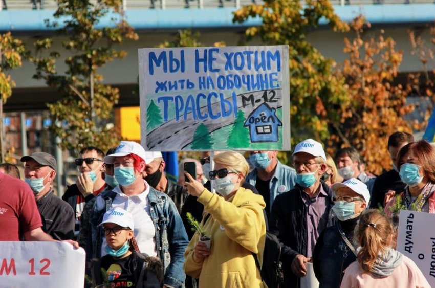 Организатором сбора выступило местное отделение партии «друга Татарстана» Владимира Жириновского. На значках надпись: «Я спасаю свой дом от трассы М12. 2020». Собственно, флаги Либерально-демократической партии России развевались по всему периметру согласованного «майдана».