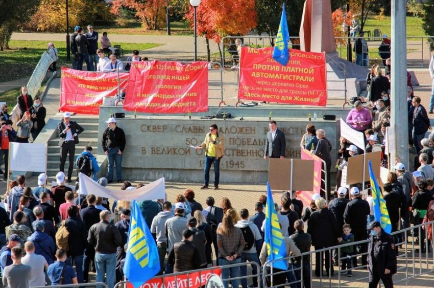 Тем временем собравшиеся разворачивали плакаты и транспаранты с различными лозунгами: «Мы не хотим жить на обочине», «Оставьте нашим детям лес и чистый воздух», «Мы, жители Орловского поселения, против автомагистрали через деревню Орел. Здесь не место для трассы (М-12). Здесь место для Жизни!!!», «Зеленый берег», «ДПК «Дружба». Не сносите нас», «Дорога, идущая по головам», «Отведите трассу от Орла», «Не хотим жить под мостом» и другие.