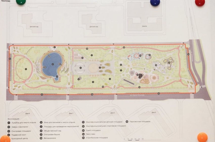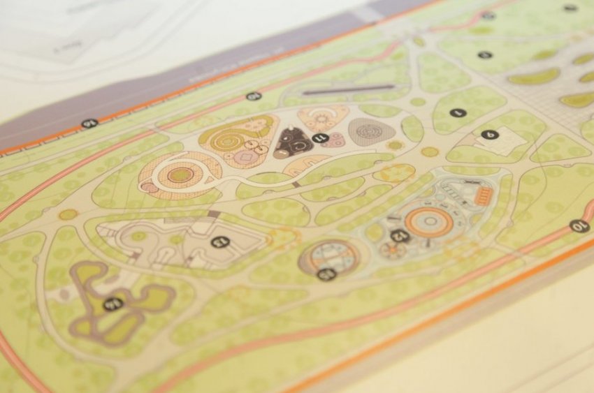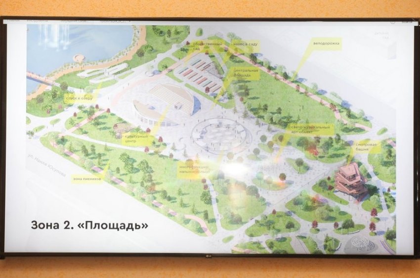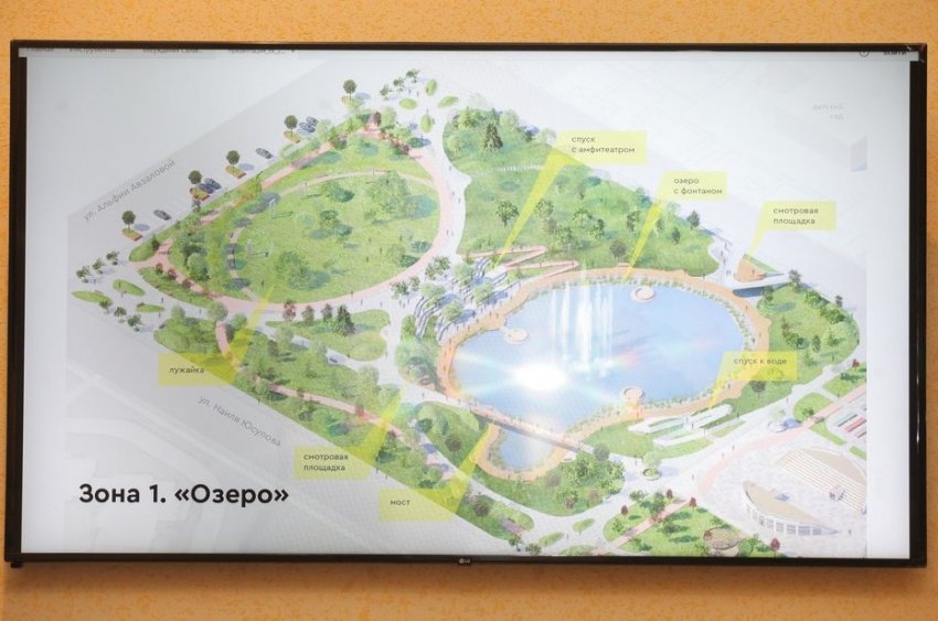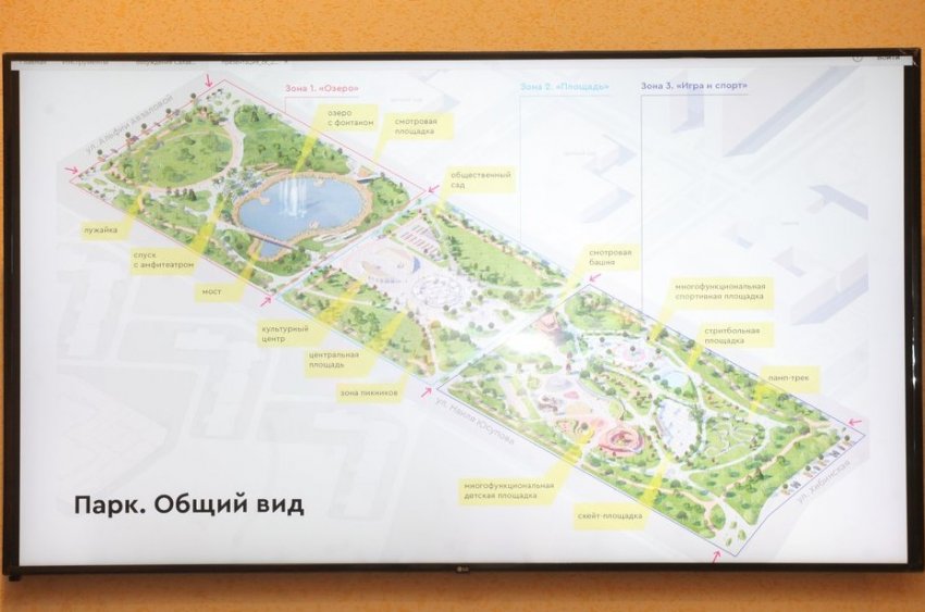 По проекту, парк делится на три части: зона «Озеро», зона «Площадь», зона «Игры и спорт».