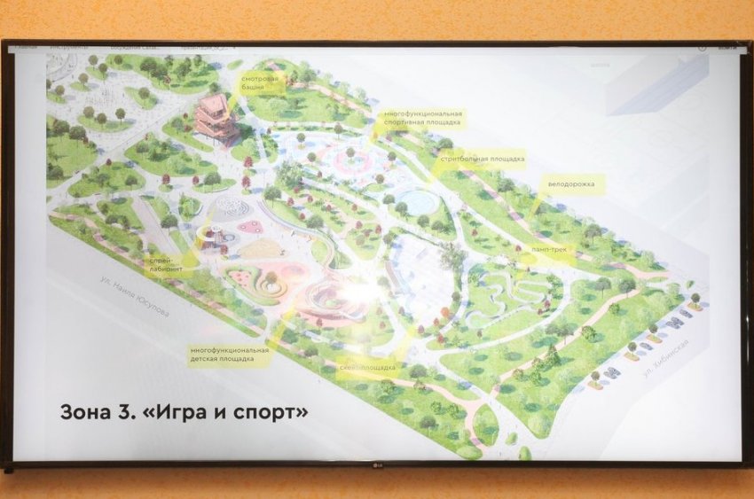 Зона «Игры и спорт» включит в себя сразу несколько спортивных площадок: многофункциональную для фитнеса, детскую, скейт-площадку, памп-трек для велосипедов, площадку для стритбола. А еще там хотят поставить смотровую башню, с которой должен быть виден весь парк.