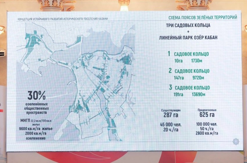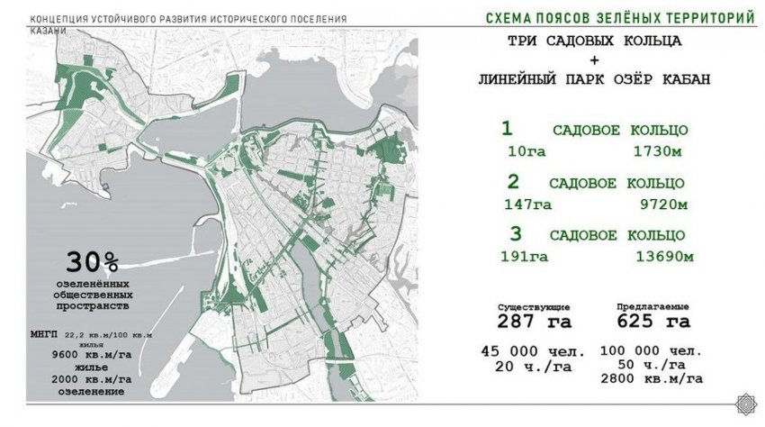 Поэтому в историческом сердце города предложено организовать три садовых кольца (а не два, как говорилось еще в июле): первое будет опоясывать кремль, второе пройдет по улице Пушкина и захватит Черное озеро и сад «Эрмитаж», а третье пойдет еще шире, начнется с Русско-немецкой Швейцарии (за парком им. Горького), пройдет через Госпитальный сад и Нижний Кабан и спустится к Волге. Реализация этого проекта позволит усилить озеленение центра города на 30%, создать обширные общественные пространства и обустроить большую прогулочную зону.