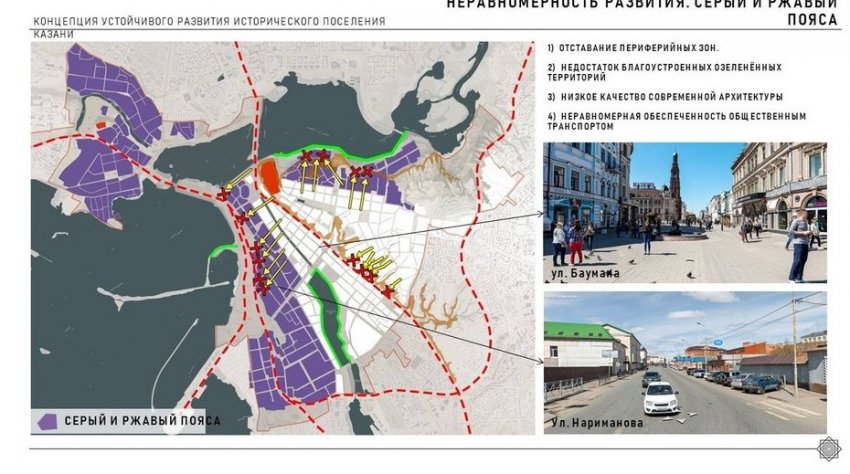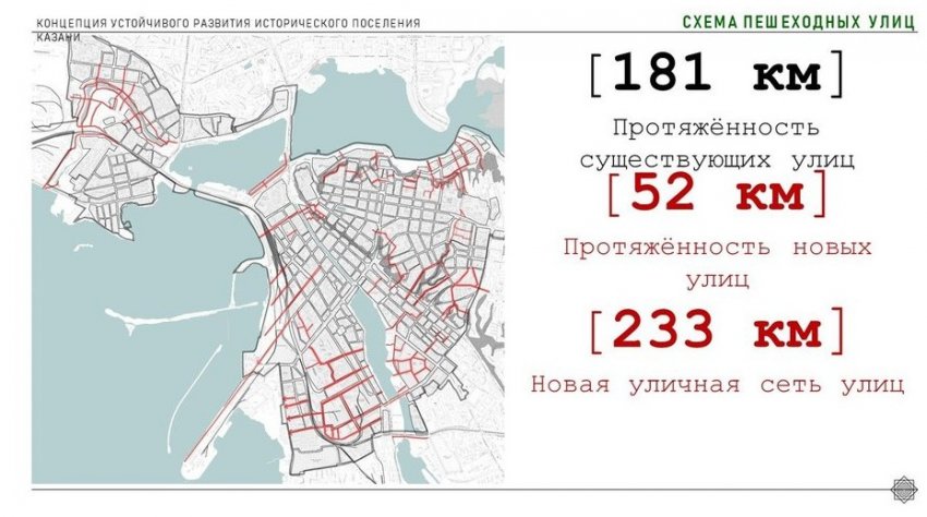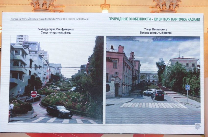 - в развитии предлагается учитывать ландшафт города — три террасы, последовательно спускающиеся от Кремля к Казанке и Волге, бывшие овраги, исторические сады и рощи и, конечно, три основных акватории исторического ядра — Волги, Казанки и сети озер Кабан. А еще предложено развивать поперечную сеть улиц — не вдоль этих террас, а перпендикулярно им. Таким образом, вертикально взбирающиеся вверх улицы (например, Астрономическая) могут стать основой открыточных ландшафтов, как в Сан-Франциско, а не унылыми с визуальной точки зрения пространствами;