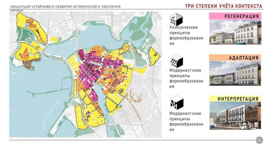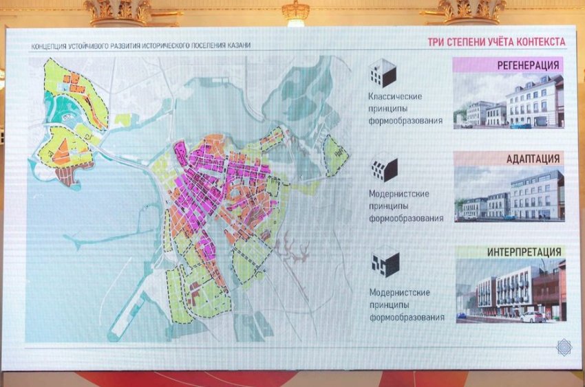 Под этой громоздкой словесной конструкцией кроется полномасштабная методология того, что, как и по каким принципам можно строить в историческом ядре Казани в ближайшие 10—15 лет, как развивать зеленые зоны и дорожную сеть — и не потерять исторической, культурной и функциональной идентичности города. Два года архитекторы, историки, социологи, культурологи и другие специалисты бились над тем, как совместить «две вещи несовместные»: одновременно и застроить пустующие территории в границах Казани, в том стиле, какими они были в XIX веке, и завести сюда бизнес, и при этом не нарушить общий историко-культурный контекст, сохранив уникальное лицо Казани, узнаваемое и самобытное.