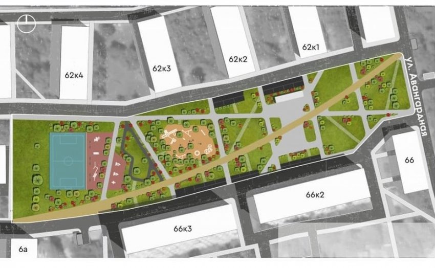 Сквер по улице Авангардной — очень интересная территория, утверждают в творческой группе. Основные задачи, по мнению авторов, заключаются здесь в уборке мусора и гаражей, сохранении существующего озеленения и пешеходных маршрутов, а также в привнесении в проект «эстетической привлекательности» — с тем, чтобы «сделать эту заброшенную территорию с огромным зеленым массивом точкой притяжения для местных жителей», — заверяют в творческой группе. Запланировано строительство футбольного поля, спортивной площадки с зоной воркаута и детской трассой памп-трек, а также детской площадки для всех возрастов.
