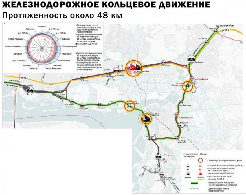 Маршрут внутригородской кольцевой железной дороги: вокзал «Казань-1» — Новое Аракчино — Восстание (переход на станцию метро «Северный вокзал») — Компрессорный — Ометьево (переход на станцию метро «Аметьево») — Вахитово — «Казань-1». Возле станций городской электрички обещают создать 17 транспортно-пересадочных узлов (ТПУ) с перехватывающими парковками.