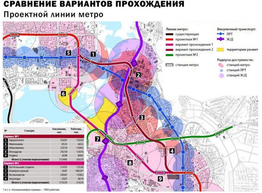 В генплане нет единой четкой концепции, как дальше будет развиваться казанское метро, решение о строительстве которого было принято вопреки расчетам проектировщиков генплана. По словам Айдара Абдулхакова, для второй линии после станции «Сахарова» предусмотрено два направления развития с выходом в Ново-Савиновский район: через «Седьмое небо» — новый микрорайон ЖК «Казань XXI век» и Компрессорный завод, и альтернативное — через «Акчарлак», что исключает дублирование идущего по проспекту Победы скоростного трамвая.