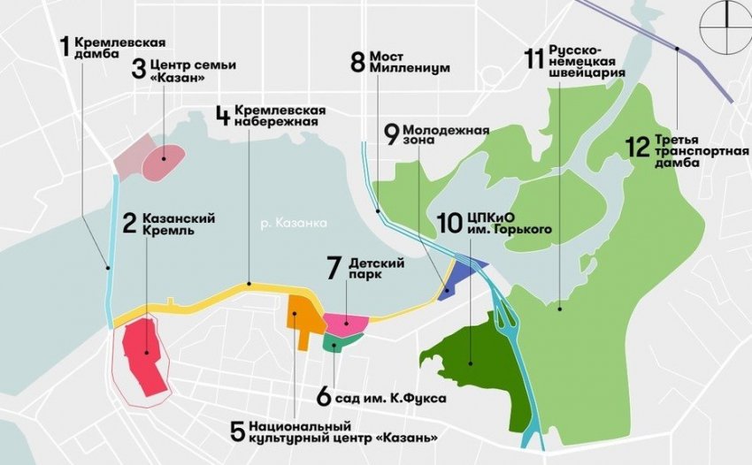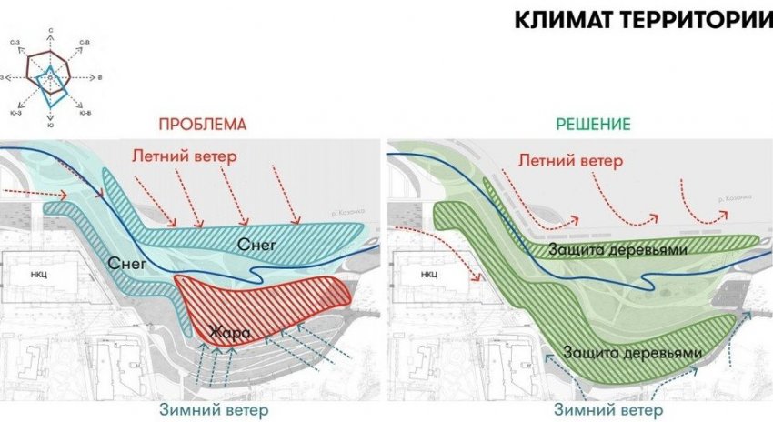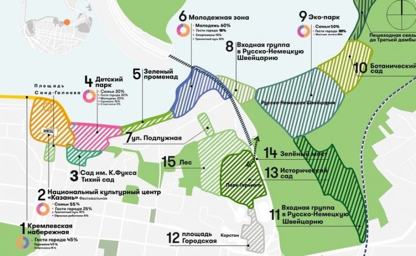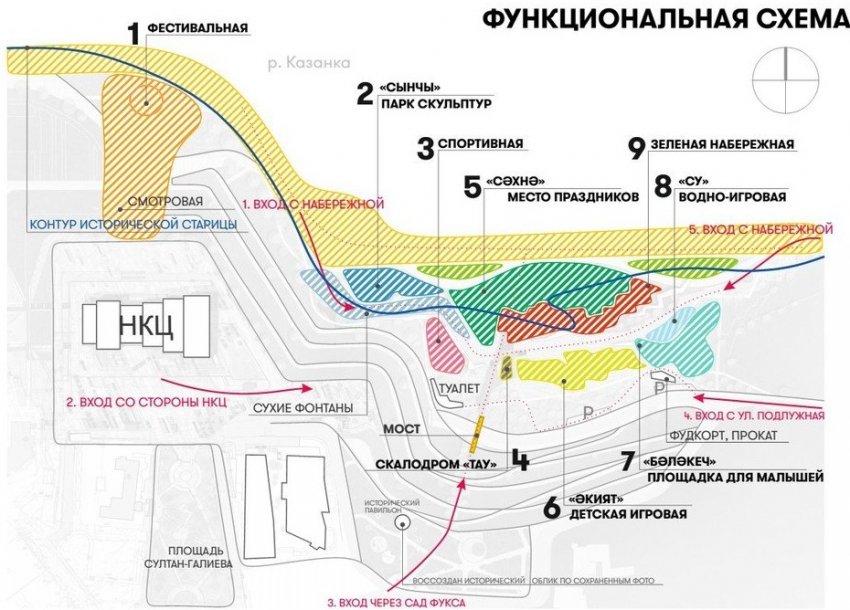 В рамках проекта предлагается разместить на террасах за НКЦ парк скульптур, две игровые площадки — для малышей и детей постарше, спортивную площадку, скалодром, сухие фонтаны, водную игровую площадку, фуд-корт и площадку для проведения фестивалей в границах смотровой площадки, с которой открывается вид на Казанку.