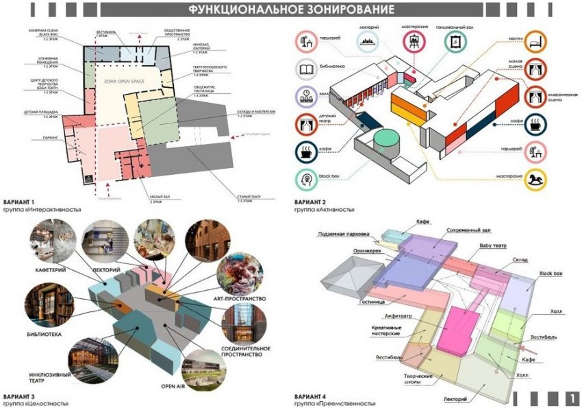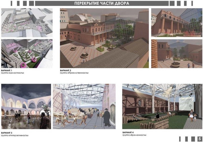 В итоговой презентации на выбор представлены четыре варианта функционального зонирования территории и по три варианта ребрендинга и благоустройства территории. За счет расширения площади во внутреннем дворике предлагается сделать открытый амфитеатр. Его проект также представлен в трех вариантах. Первый из них, собственно, и выглядит как амфитеатр, во втором фокус внимания смещен в центр, вокруг которого расположены трибуны-ступеньки. В третьем случае территория наполнена трибунами, скамейками и местом для выставочных стендов.