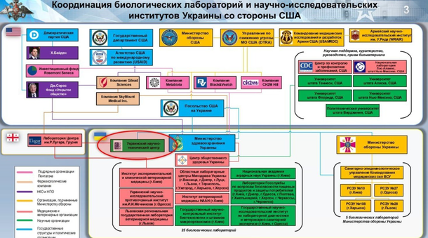 - Кроме того, российские военные в спецоперации на Украине установили, что с 2019 по 2021 годы американские ученые проводили испытания потенциально опасных биологических препаратов на пациентах областной клинической психиатрической больницы №3 в Харькове. Деятельность лаборатории остановили в январе 2022 года, а все оборудование и препараты были вывезены на запад Украины. В Минобороны России заявили о наличии показаний ряда свидетелей «этих бесчеловечных экспериментов», однако их имена не раскрываются в интересах обеспечения их безопасности.