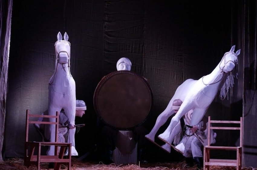 Фигура отца, хоть и оживает (впрочем, режиссер уже размышляет о другом варианте действий), изначально напоминает каменных истуканов, к примеру балбалов. И когда братья отправляют стрелы в щит на его груди (а дети в зале, наконец, притихают), хочется, чтобы это действие не было обыденностью — в попытке соревноваться братья заступают за черту, после которой уже нет возврата.