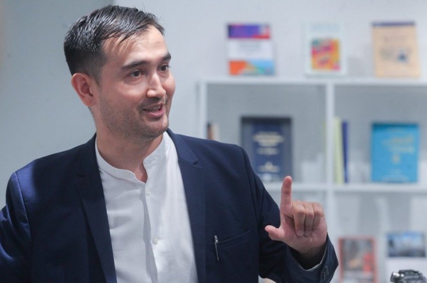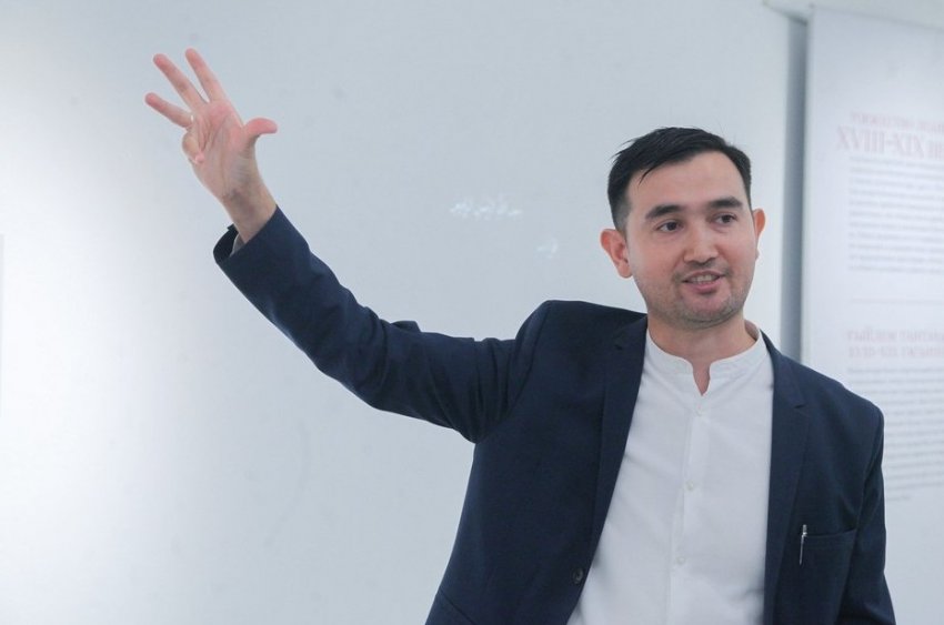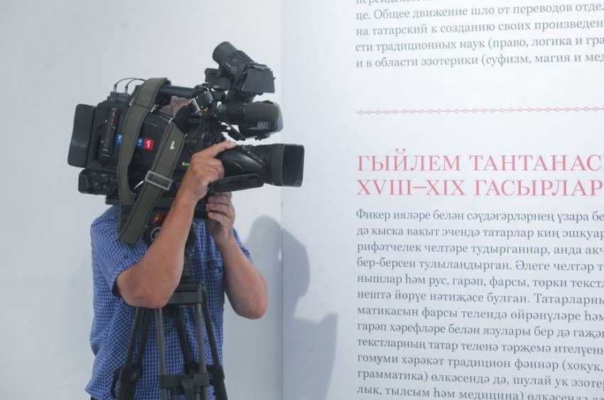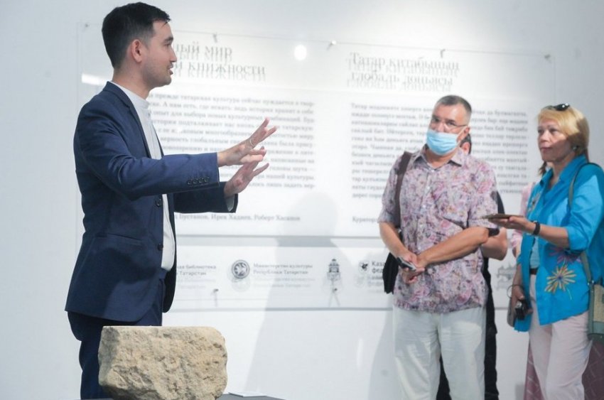 Известно, что молодой ученый — апологет изучения дореволюционной культуры, которому не близки восторги по поводу джадидского движения с его обращенностью в сторону Европы и воспеванием советской татарской культуры. И на пресс-показе он это демонстрирует, став практически в упор с изображением азбуки — вот как мы видим нашу культуру.