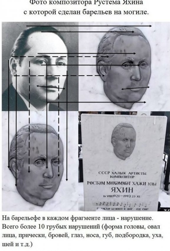 В обращении Байгильдеев пишет, что 25 апреля 2011 года он обращался с письмом по установке памятника и мемориального комплекса композитору Рустему Яхину на Ново-татарском кладбище — «в связи с искажением лица на барельефе могильной плиты. Ноты на могильной плите так же изображены с ошибками» (орфография и пунктуация автора сохранены — прим. ред.). Еще одно письмо касалось мемориальной доски Яхину по адресу: ул. Татарстан, д. 7 (здесь он жил с 1978 по 1993 годы): «Причина — на барельефе лицо композитора грубо искажено». В доказательство выслал примеры искажений.