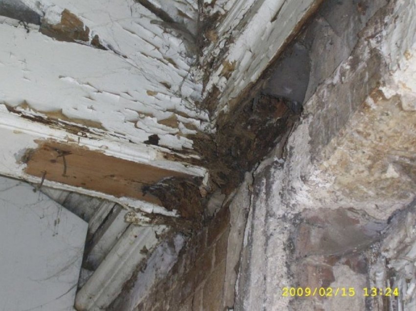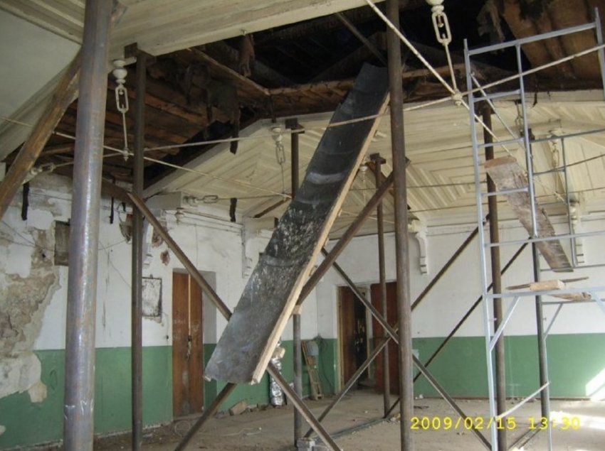 С помощью пояса, выполненного в уровне потолка третьего этажа, была стабилизирована и предотвращена от дальнейшего разрушения южная стена здания, находящаяся в аварийном состоянии и отклоненная от вертикали почти на 10 см, что привело к почти полному обрушению потолка зала, выполненного в виде деревянных карт, и вырыванию из стены деревянных консолей.