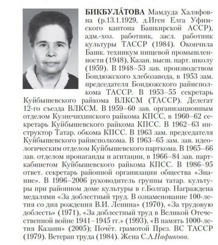 Бикбулатова в молодости была административно-хозяйственным работником советской системы. По-сегодняшнему — чиновником. На муниципальном уровне. С 1953 года — в структурах райисполкомов. С 60-х годов — по идеологической и агитационной части. В 1989 году, как и положено, вышла на пенсию, но естественно продолжила работать. До 1996 года была секретарем районной организации всесоюзного общества «Знание»: огромной структуры с учеными и академиками, созданной большевиками в послевоенные годы для просветительской деятельности и антирелигиозной пропаганды в массах (общество ликвидировано в 2016 году).