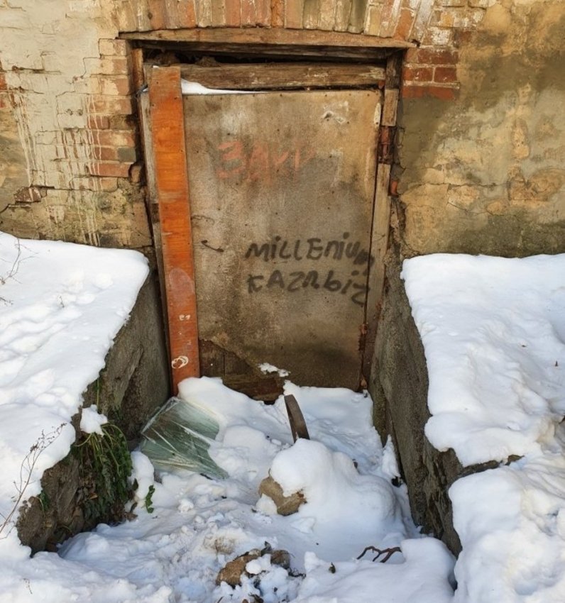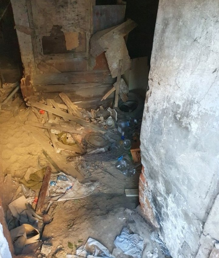 Впрочем, проникнуть внутрь можно без проблем через проем низко расположенного окна с торца здания и через приоткрытую дверь цокольного этажа. Внутри — следы человеческого обитания: мусор, пустые бутылки и баллоны из-под спиртного, ящики, шины, оставленные бывшими хозяевами вещи.
