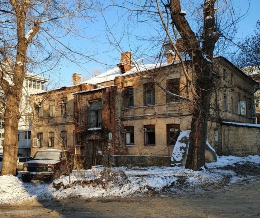 Припаркованные машины обитателей соседних домов упираются чуть ли не в стену дома. Пристрой, возведенный уже в советское время, весь обклеен объявлениями о приеме на работу и помощи нарко- и алкозависимым.