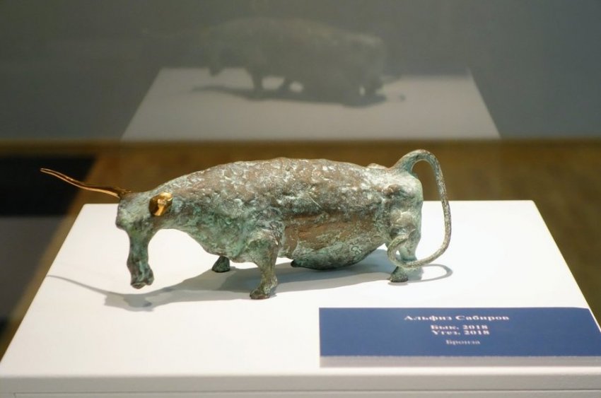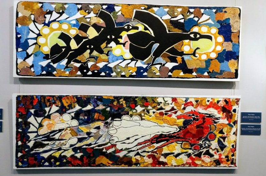Здесь может возникнуть, казалось бы, противоречие, ислам и изображения живых существ невозможны. Однако художники обратились к изобразительной культуре тюрков до принятия ислама — Тенгри, Богу вечного неба. Здесь животные — это тотемы, как, например, в пермском зверином стиле. Неслучайно центром второго зала можно назвать четыре работы из полиптиха Марата Вафина «Звездная река», это фигуры бегущих или спешащих куда-то птиц и зверей, выполненные яркими и красными мазками маслом по холсту. Как по секрету сообщила Мария Филатова, художник-любитель пастозной живописи часто экспериментирует с красками, добавляя в них даже чеснок.