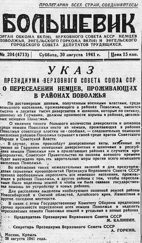 Указом от 28 августа 1941 года полмиллиона поволжских немцев были отправлены в Среднюю Азию и Сибирь. В отличие от других депортированных народов, немцам так и не позволили вернуться на свою землю в Поволжье, и спустя годы для большинства из них новым домом стала Германия.