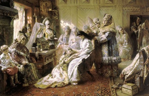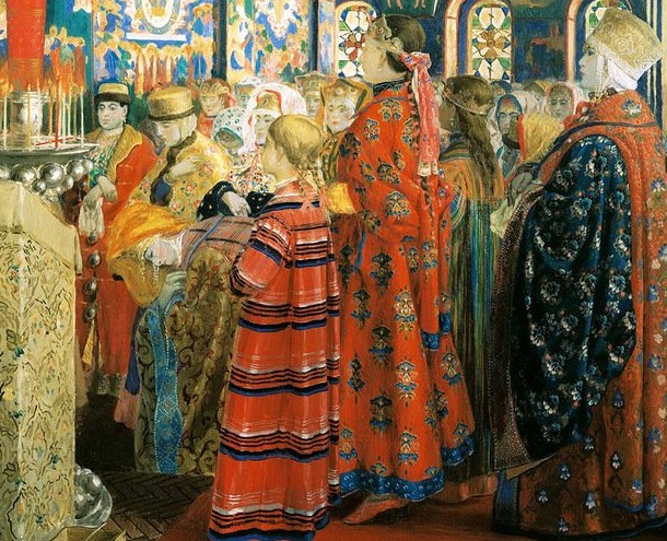 Достаточно бросить беглый взгляд на русские костюмы XVI—XVII столетий, чтобы найти в них поразительное сходство с татарско-азиатскими одеждами. Вот как красочно и с юмором описывает П.Н. Милюков впечатление, производимое на европейцев появлением русских послов в XVII веке в странах Западной Европы: «Их (т. е. московских послов) появление на улице в парчах и в шелку красного, желтого или зеленого цвета, в длиннополых халатах с высочайшими воротниками и длинными рукавами, в меховых шапках азиатского покроя, собирало около них толпу зевак: не то это был маскарад, не то религиозная процессия, не то просто этнографический курьез, вывезенный каким-нибудь предприимчивым антрепренером из заморских стран, вместе с крокодилами и африканскими львами».