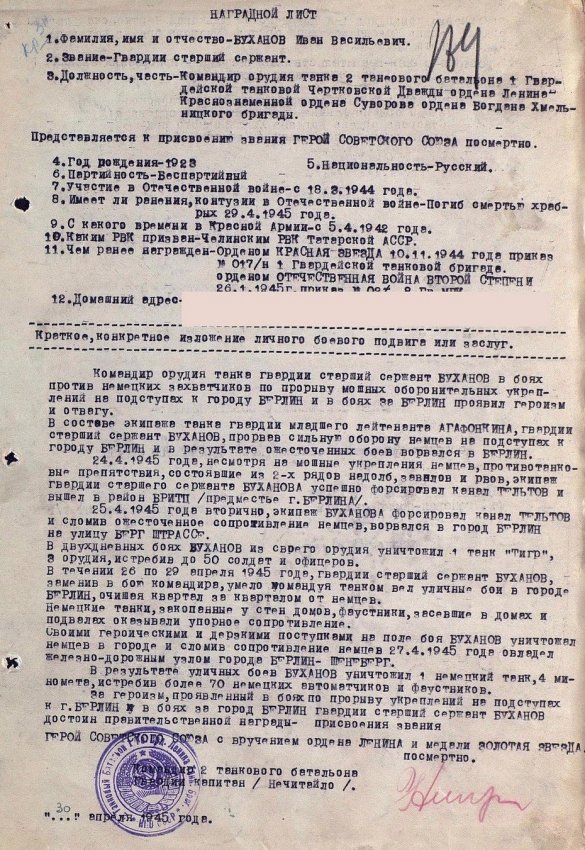 25 апреля 1945 г. экипаж Буханова повторно форсировал канал Тельтов и, сломив ожесточенное сопротивление немцев, ворвался в город Берлин на улице Берг Штрассе.
