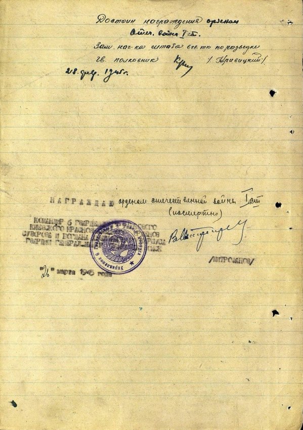 Погиб 20 февраля 1945 г. Награжден: орден Отечественной войны 1 ст. (посмертно)».