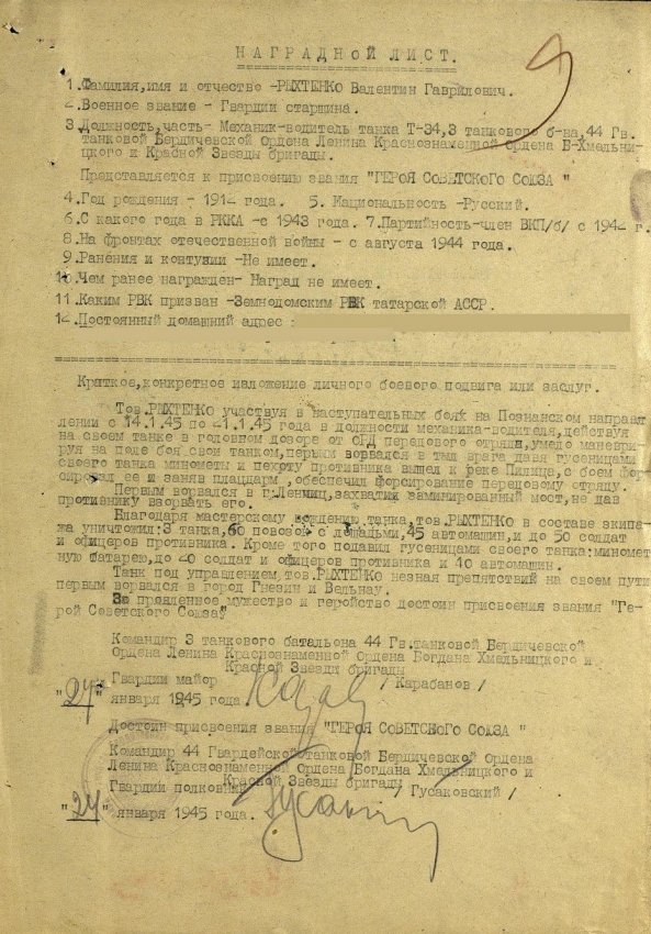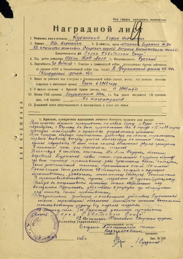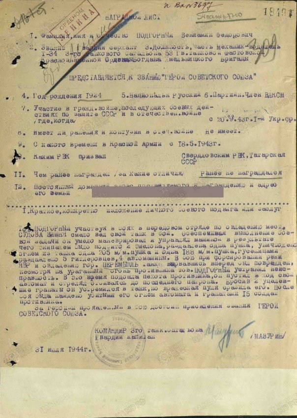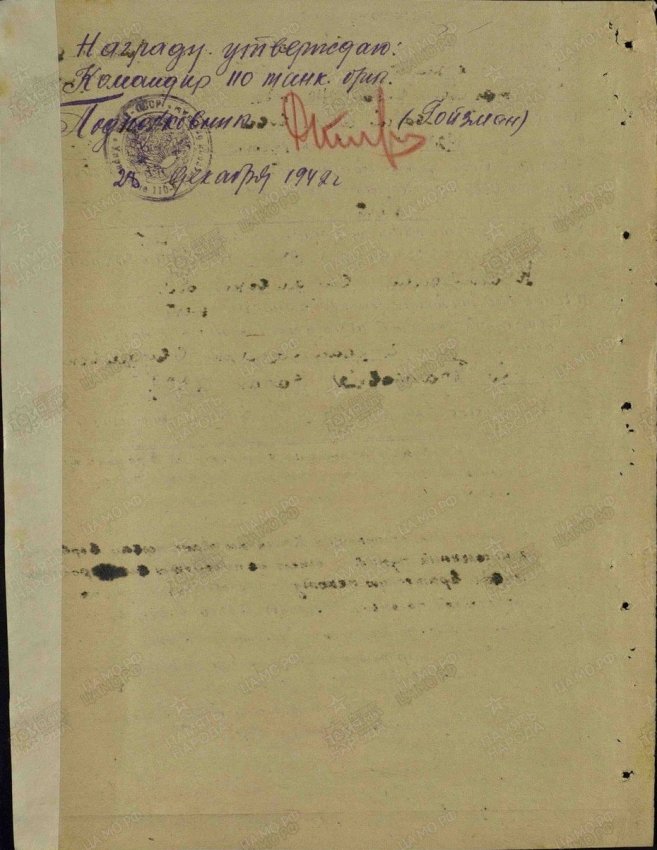 «1916 г.р., мобилизован Кайбицким РВК, гвардии старший сержант, механик-водитель танка Т-34-85 3 отдельного гвардейского мотоциклетного батальона.