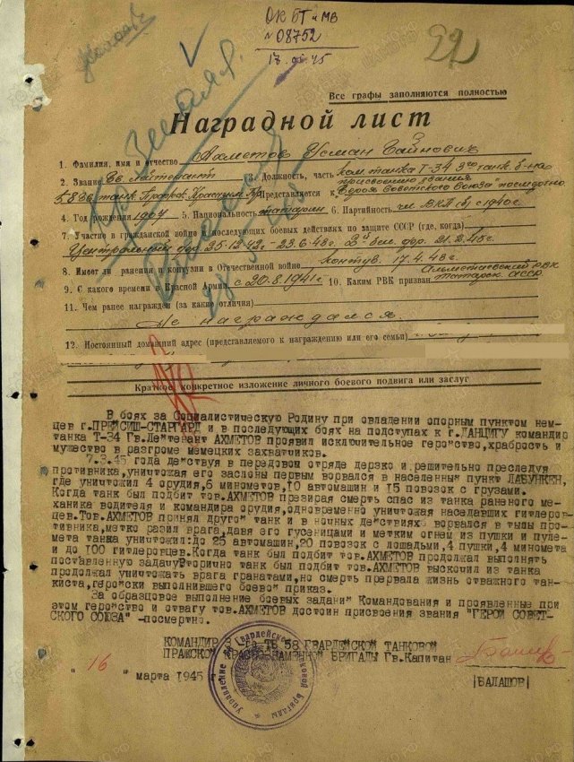 Когда танк был подбит, тов. Ахметов, презирая смерть, спас из танка раненого механика-водителя и командира орудия. Одновременно уничтожил наседавших гитлеровцев. Тов. Ахметов принял другой танк и в ночных действиях ворвался в тыл противника, разил врага, давя его гусеницами и метким огнем из пушки и пулемета танка уничтожил до 25 автомашин, 20 повозок с лошадьми, 4 пушки, 4 миномета и до 100 гитлеровцев.