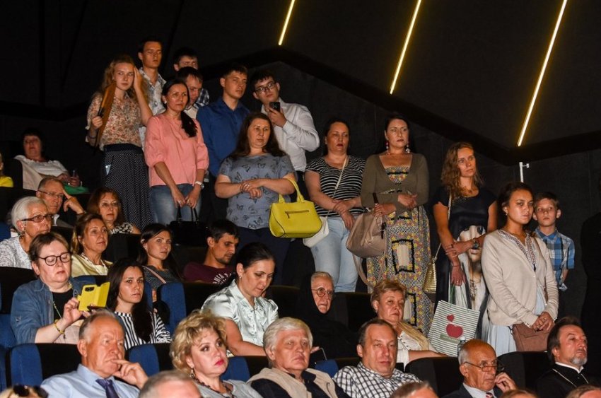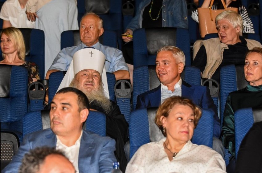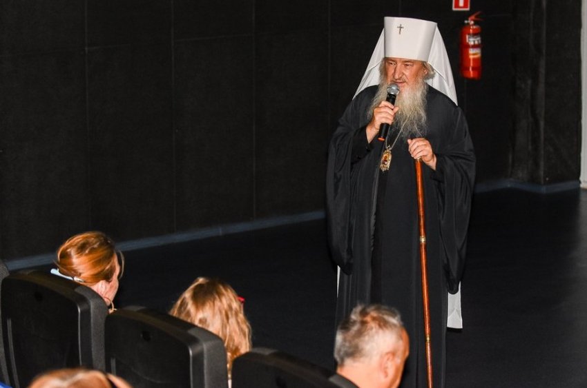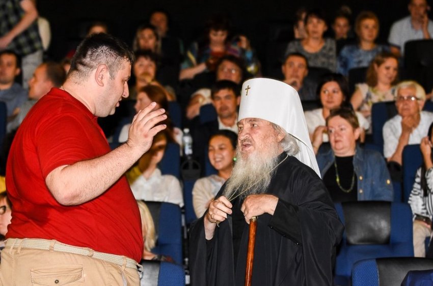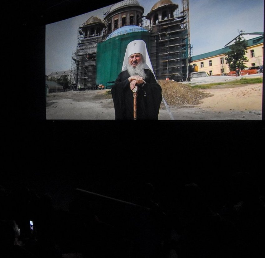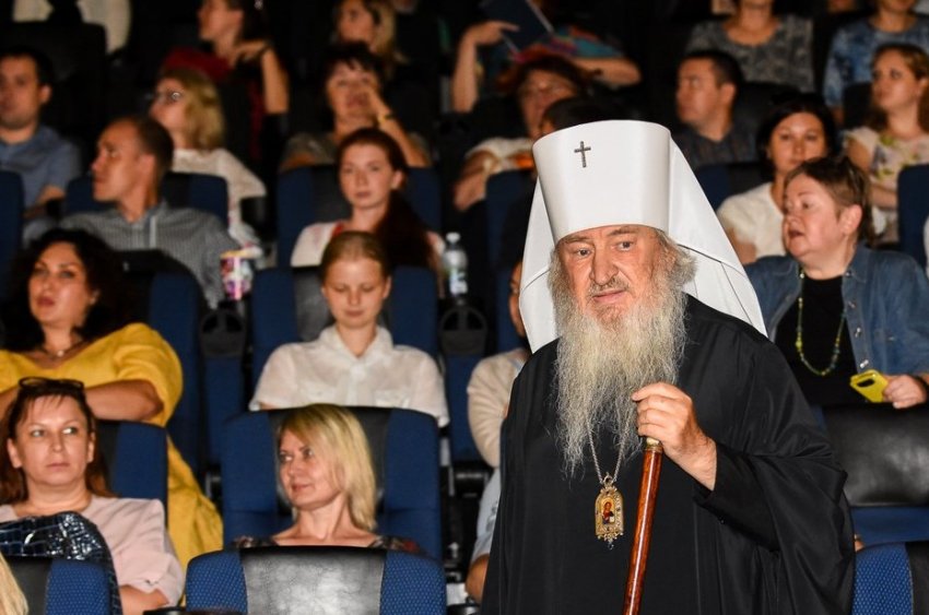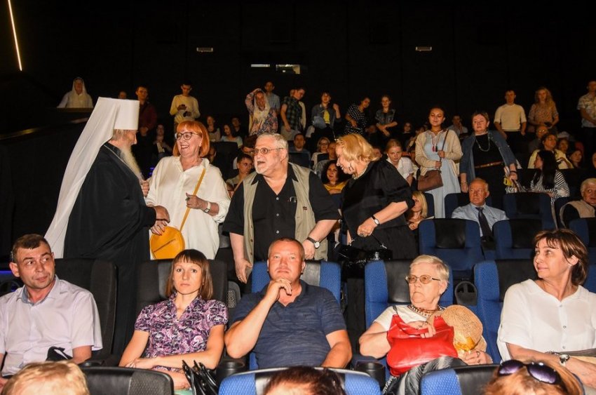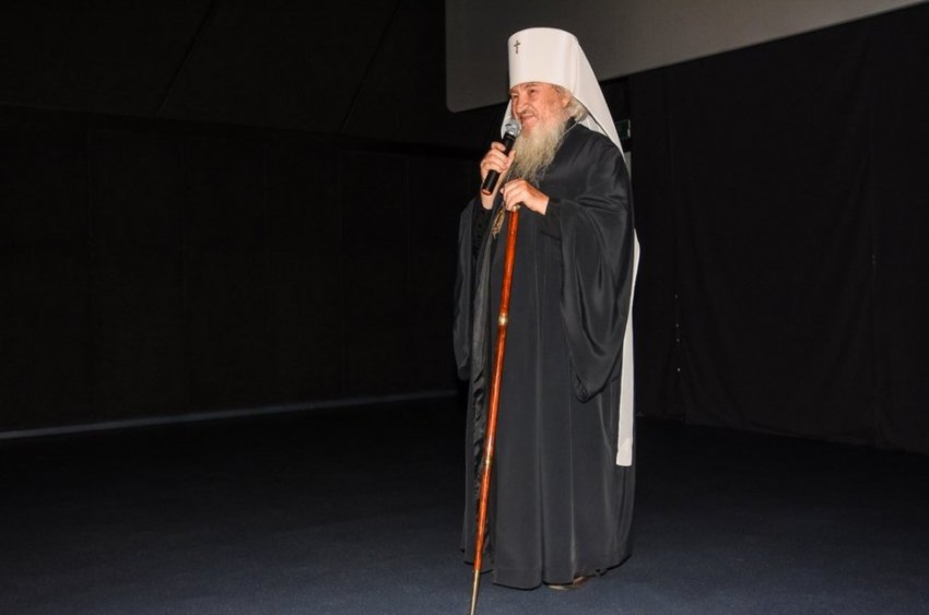 Чуть-чуть задержавшись из-за огромной пробки подъезжает митрополит Казанский и Татарстанский Феофан, кстати, в середине июля исполнилось 3 года с момента его назначения на Казанскую кафедру. «Осанна» снята по его благословению, да и вообще без помощи главы митрополии съемки шли бы сложнее. У владыки был трудный день — утром освящение храма на Свияжске, потом освящение нового корабля в Зеленодольске, но пропустить премьеру он, тем не менее, не мог.