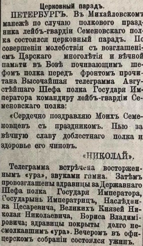 Сохранилось и приказание по устройству церковного парада по поводу храмового праздника Военно-Кремлевской церкви 16 августа. И мы знаем, что форма одежды для того парада была «китель при шарфе и старшем ордене».