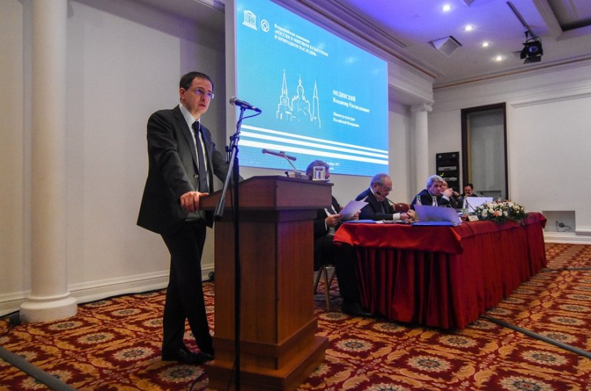 «С началом индустриального века стремительно утрачиваются культурные ценности. Особенно остро этот вопрос встал в двадцатом веке после Первой и Второй мировых войн. Устав ЮНЕСКО был принят сразу после окончания Второй мировой войны, в октябре 1945 года, в качестве основной задачи было зафиксировано сотрудничество в области науки, образования и культуры. Россия — член ЮНЕСКО с 1954 года. В 1972 году в ЮНЕСКО была принята конвенция по охране всемирного культурного и исторического наследия. С этого момента знаменитый список начал формироваться», — напомнил Владимир Мединский.