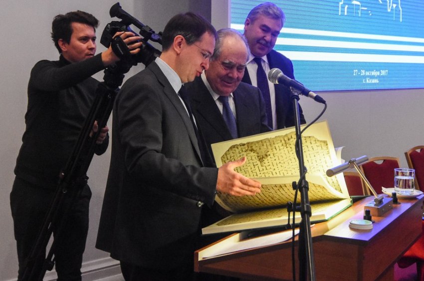 Владимир Мединский приехал в Казань с подарком. Он преподнес государственному советнику Республики Татарстан Минтимеру Шаймиеву уникальный Коран, выпущенный тиражом всего пять экземпляров, пояснив, что один экземпляр российский президент преподнес в дар одному из руководителей арабской страны. Министр культуры подчеркнул, что благодаря стараниям Фонда «Возрождение», который возглавляет Шаймиев, регион стал лидером по сохранению объектов культурного наследия.
