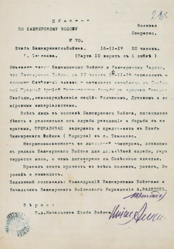 С офицерами сложнее. Девятая башкирская дивизия, испытывавшая острую нехватку командного состава, еще осенью была укомплектована офицерами Юго-Западной (Оренбургской) армии. Некоторые из них на тот момент даже командовали полками: штабс-капитан Байрошевский, подполковник Цветков. Чтобы нейтрализовать офицеров, Валидов вечером все того же 16 февраля разослал по частям секретный приказ, ставший для многих смертным приговором: «Всех лиц в составе башкирского войска, пытающихся бежать и уклониться от службы революции и борьбы с ее врагами, приказываю задерживать и представлять в штаб башкирского войска (корпус) в с. Темясово».