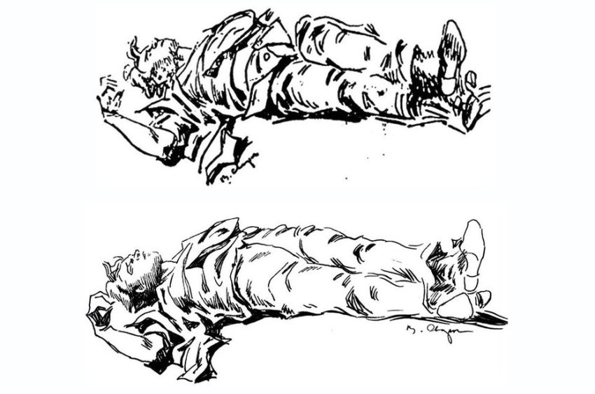 С этой же травмой связана другая — рана в области внутреннего угла правого глаза в виде вытянутого стерженька. Она вообще никак не отражена в актах. Ее и на фотографии сложно увидеть, но видно на первой посмертной маске (их было несколько) под определенным углом. Крусанов разобрал несколько версий появления этой раны, а потом провел «следственный эксперимент». По его версии, это может быть след от курка нагана, а вмятина (или проломленный череп) на лбу — от рукоятки нагана.