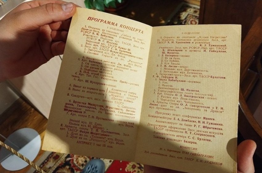Представление о вечерах дает программка 1944 года. Поет Фахри Насретдинов, на баяне играет Рукия Ибрагимова, театр Камала показывает отрывки из «Собаки на сене» и «Ходжа Насретдина». Русские народные песни соседствуют с оперными ариями, татарской народной классикой и башкирскими танцами.