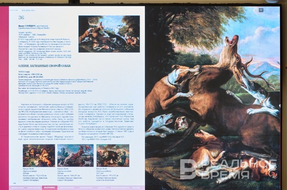 В коллекции ASG есть большие имена — например, великий фламандец Франс Снейдерс, главный анималист фламандской живописи XVII века. Его картины украшают коллекции Эрмитажа, музея Прадо в Мадриде, Пушкинского музея в Москве. Есть Снейдерс и в Казани — об этом мало кто знал буквально до последних лет, и вот теперь сокровище открыто! В альбоме есть его ранняя работа, написанная не позднее 1610 года. Кроме того, при работе над книгой была атрибутирована картина «Олень и свора собак» Юриана Якобса, художника из мастерской Снейдерса.