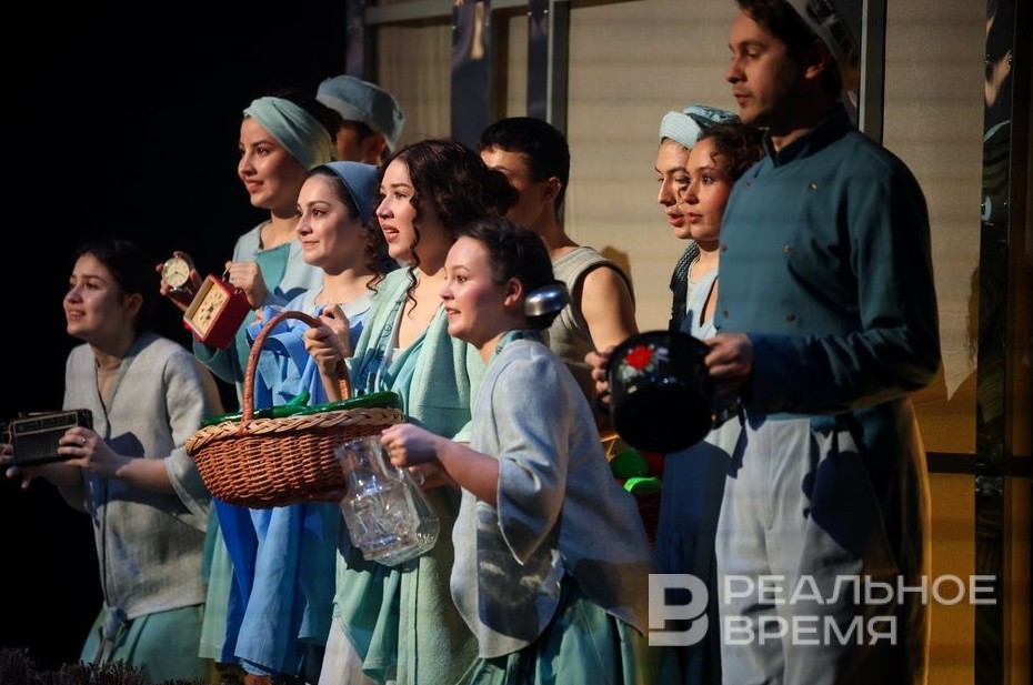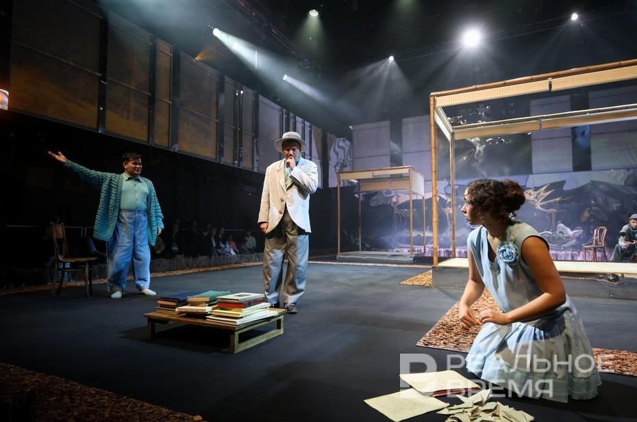 Если в оригинале царила атмосфера русской деревни, то у Бикчантаева скорее атмосфера чеховская — благодаря костюмам и общему радужному настрою, царящему в космическом, но в целом вполне провинциальном городишке. Другая ассоциация — добродушные жевуны из книг Волкова. Сергей Скоморохов вытягивает пространство сцены так, что на нее можно смотреть и по длине, и по ширине, выстраивает три павильона, закрывающиеся в стратегические моменты ширмы. Своеобразный оммаж японской архитектуре Камаловского театра. Безвоздушность прочего пространства подчеркивается стеклами, на которых проявляются сцены геноцида и картина «Над городом» Шагала, а также зеркальными поверхностями. И, конечно, постоянно появляющимися у Бикчантаева в постановках искусственными растениями.