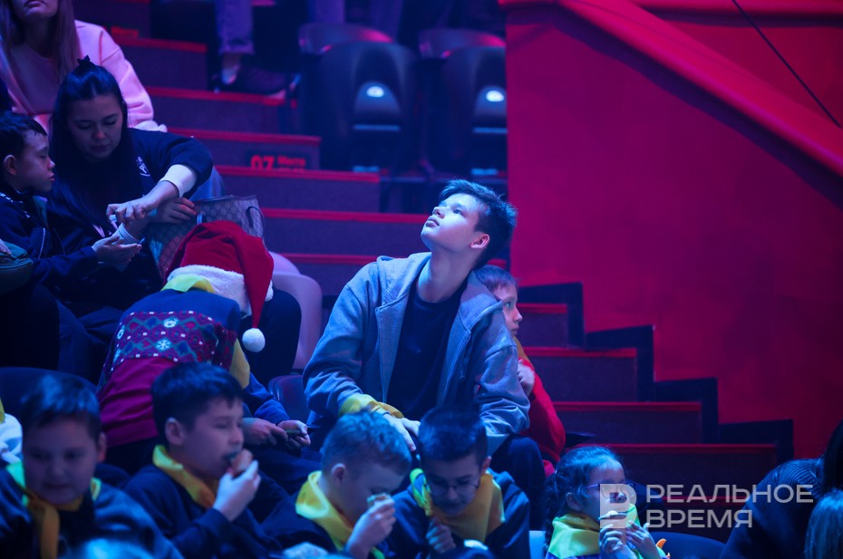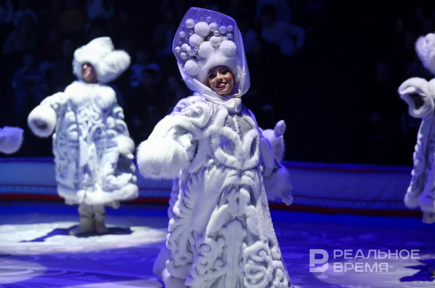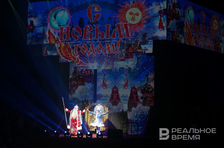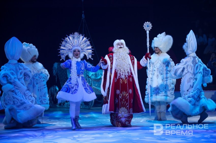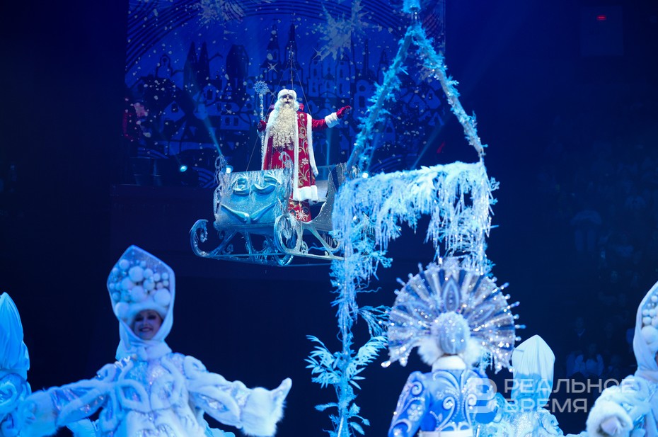 Представление начинается с полета Деда Мороза на санях. Проект и впрямь совместный, судя по номерам и участникам. К примеру, в роли Дедушки — актер цирка и театра «Сдвиг» Павел Логинов, а в роли Снегурочки — артистка балета Полина Бибикова.
