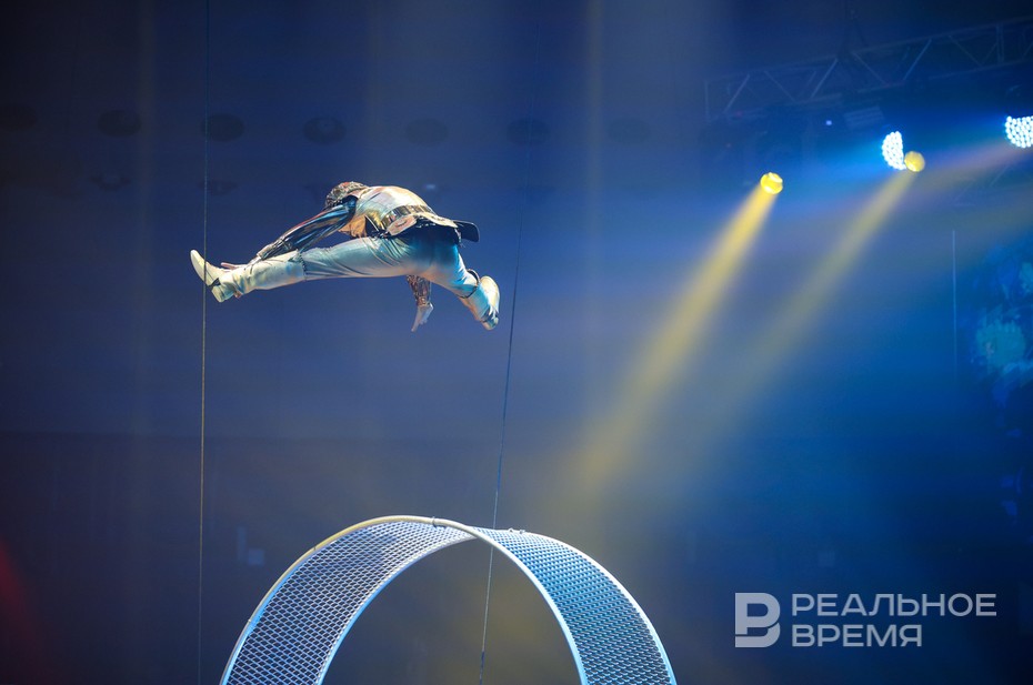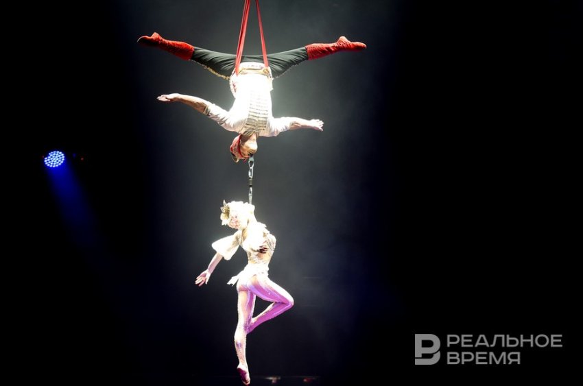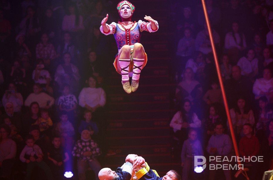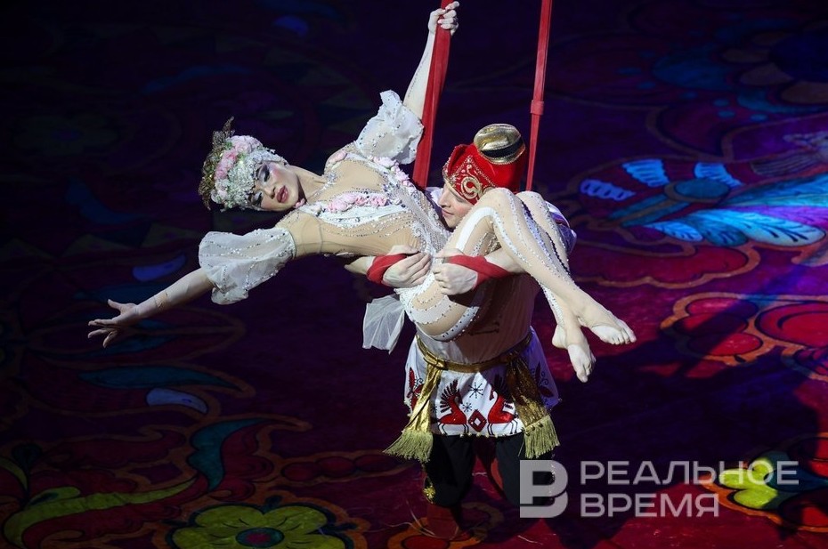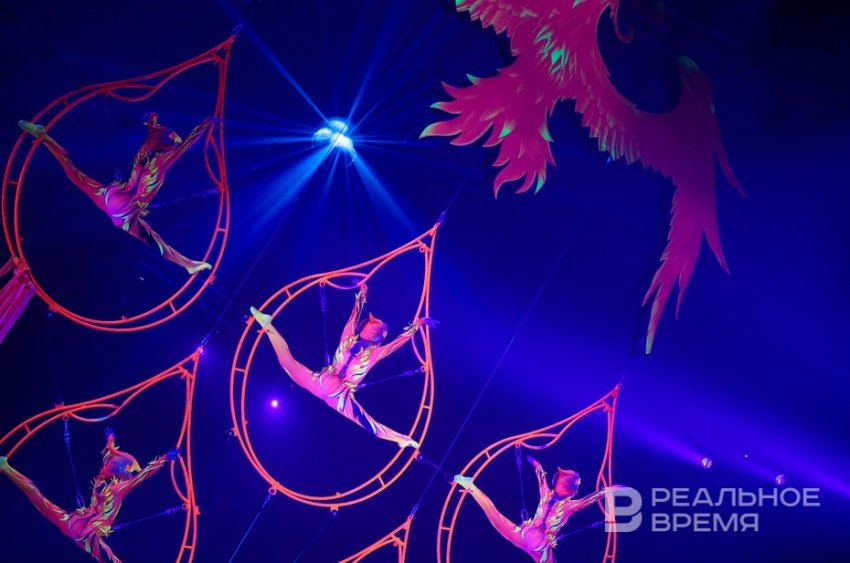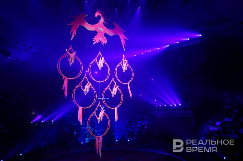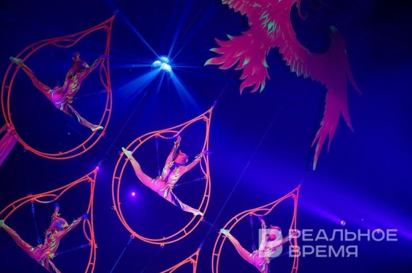 Это подготовка к выступлению наших казанских гимнасток, учениц Детской цирковой школы (Аиша Агаева, Заира Амирова, Злата Гусева, Валерия Зайцева, Елизавета Улыбина, Диана Тургунова). Красоту номера подчеркивает и оригинальная конструкция, которую техники умудряются разобрать и собрать за несколько минут.