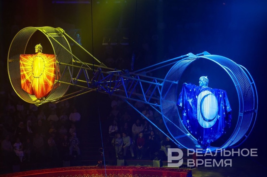 Вторая часть представления также начинается оригинально, с темы Месяца Месяцовича и Солнца: казанцы Евгений Петров и Артур Яппаров забираются в два колеса, крутящихся по кругу и устраивают смелое акробатическое представление, прыгая и бегая не только внутри, но и снаружи.