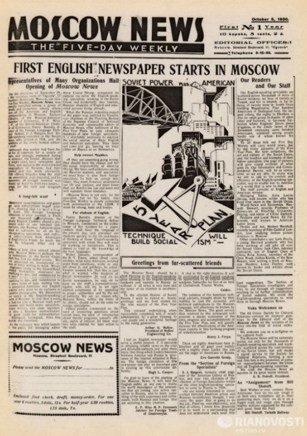 В 1930-м вышел в свет первый номер газеты The Moscow News. Читатели могли ознакомиться с новым выпуском раз в пять дней, и так она превратилась в еженедельное издание. На несколько лет выпуск газеты ставили на паузу — по решению Политбюро ЦК ВКП (б) она была закрыта в 1949—1955 годах, а ее главного редактора осудили по делу «Еврейского антифашистского комитета». В 1956-м The Moscow News вновь стала тиражироваться. В разное время газета была органом Всесоюзного общества по культурным связям с заграницей, органом Агентства печати «Новости» и Союза советских обществ дружбы с народами зарубежных стран. В этот период она издавалась на английском, французском, немецком, итальянском, испанском, арабском, эстонском, греческом, венгерском, финском, международном языке «эсперанто» и ряде других языках. На русском газету стали печатать лишь в 1980-м, во время Олимпийских игр. Независимость The Moscow News получила только в 1994 году.