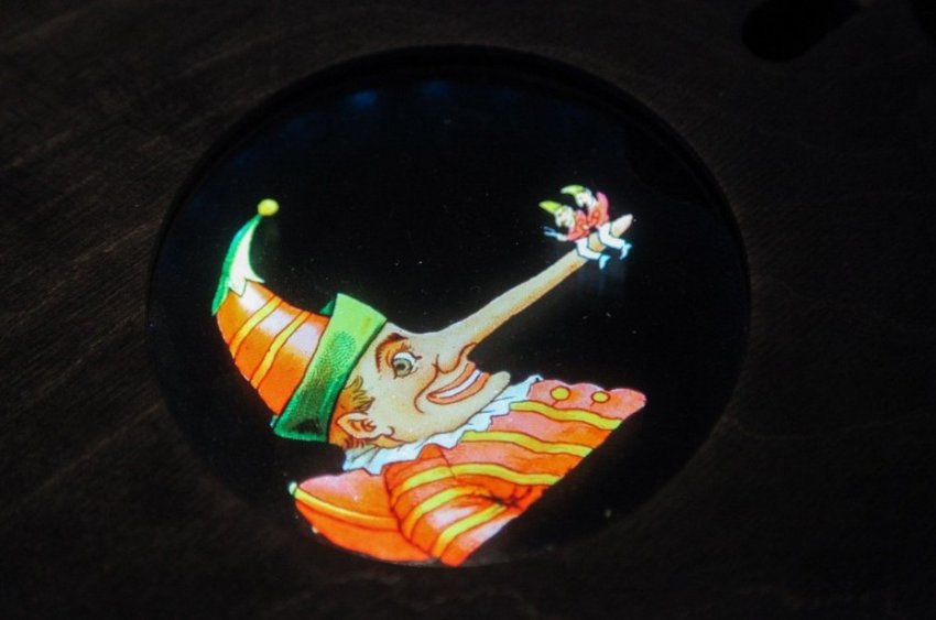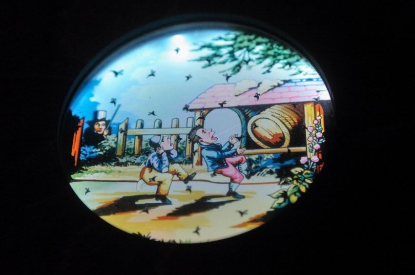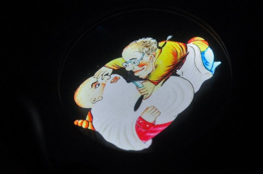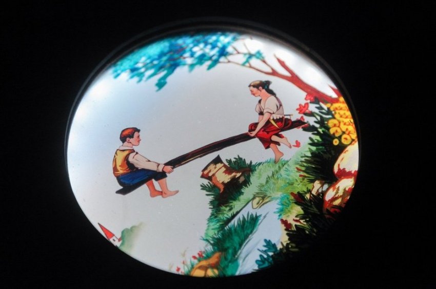 Картинки на линзах, которые увеличивались через стереоскоп, были самыми что ни на есть развлекательными: мальчик, скачущий на ослике, дети на качелях. При помощи системы линз, которые можно было двигать, «оживали» и простенькие картинки: храпящий мужчина и заползающие ему в рот мышки. Более эстетичные изображения появились уже в XIX веке, когда «волшебные фонари» заполнили мало-мальски состоятельные дома Европы. В этих «телевизорах» уже появились, например, виды города. Со временем родилась и полиорама — объемное, практически 3D-изображение, которое подсвечивается свечой. Сдвигая линзы, можно было увидеть один и тот же пейзаж, но в разное время суток. Если раньше в качестве подсветки выступала свеча, то сегодня на выставке можно просто щелкать выключателем и, заглядывая в линзу, самому сменять время суток.